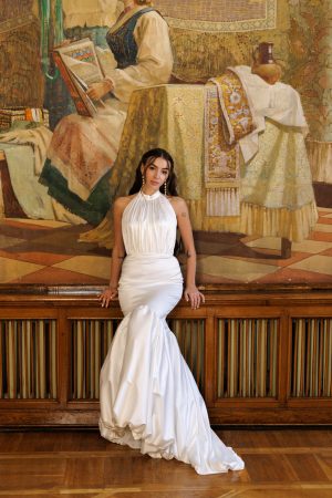 «Frida» — классическое атласное свадебное платье с закрытой шеей и пышной юбкой со шлейфом