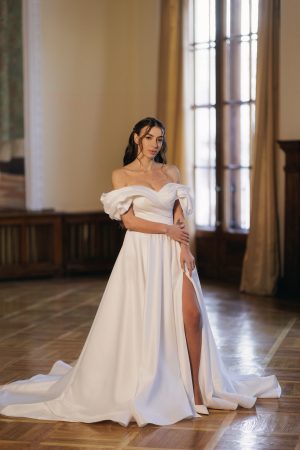 «Nensy» — стильное атласное свадебное платье с объемными плечиками и шлейфом